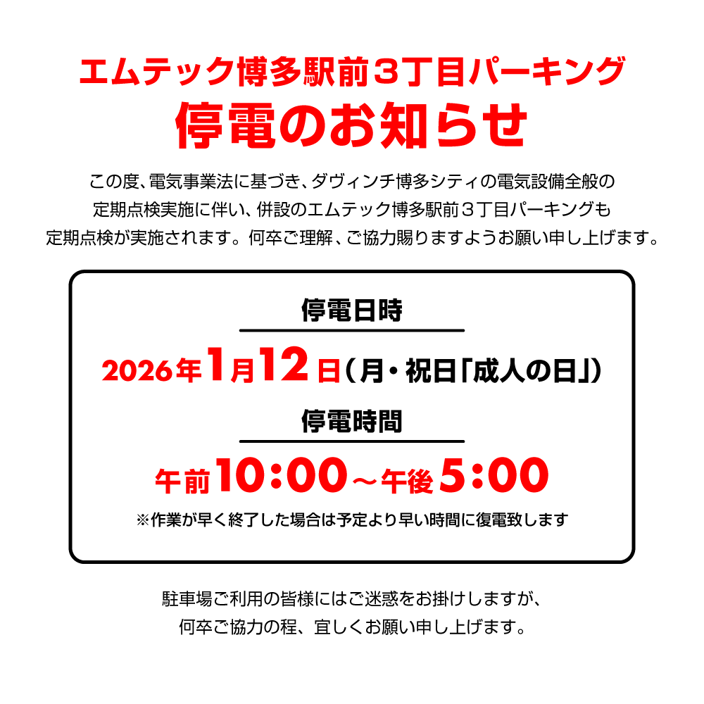 時間貸し駐車場は、上記の休業日程とは異なります。各駐車場の休業日につきましては、恐れ入りますが直接各店舗 又は 当ホームページの駐車場情報ページにてご確認ください。皆さまにはご不便とご迷惑をおかけしますが、何卒ご了承くださいますようお願い申し上げます。