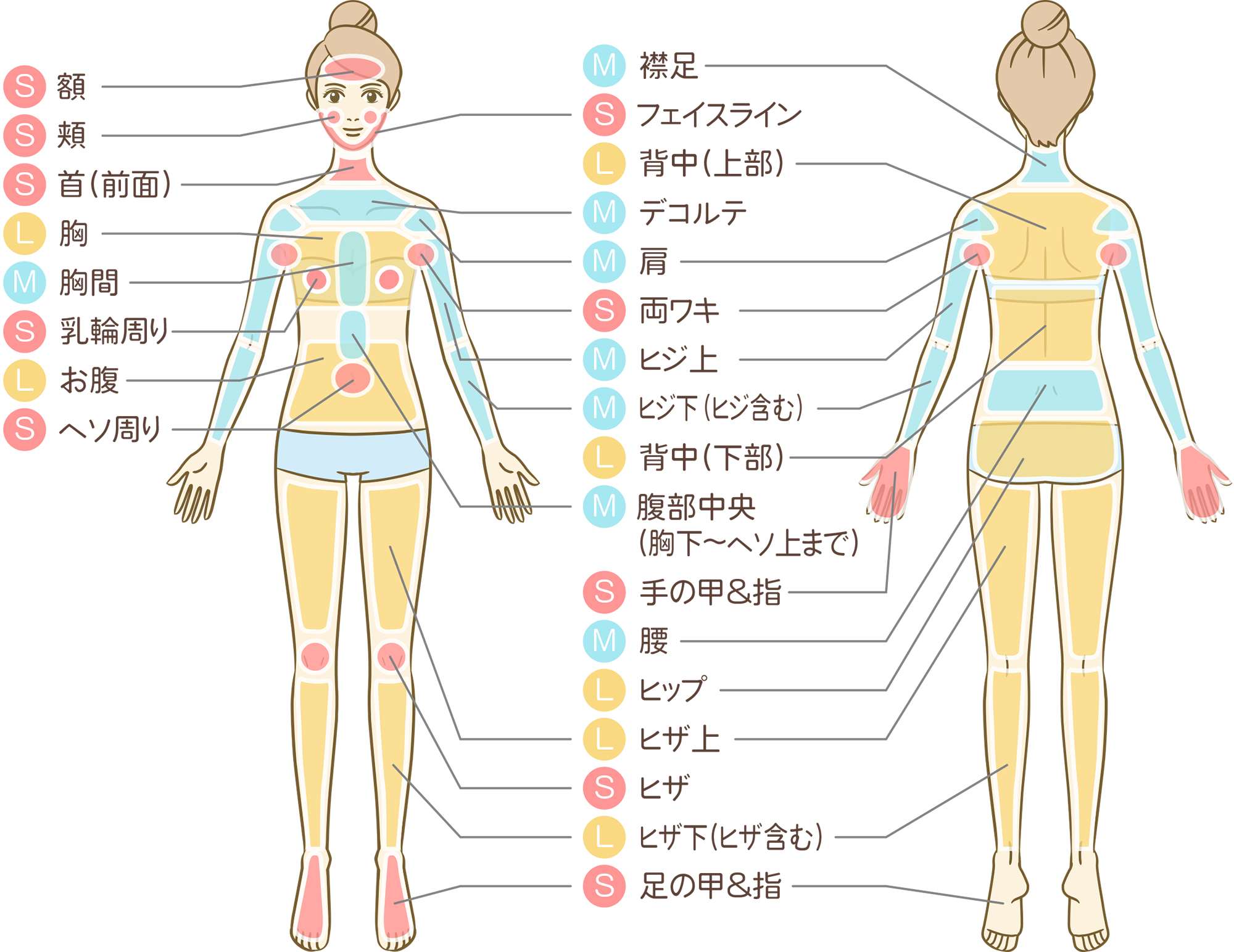 S | 額・眉間・頬・口下・口上・顎・顎下・もみあげ・フェイスライン・首(前面)・ワキ・ヘソ周り・乳輪周り・ヒザ・手の甲と指・足の甲と指・ビキニVライン(上部)・ビキニVライン(中央)・ビキニVライン(サイド)・ビキニIライン・Oライン | 4,000円 (1ヶ所) |