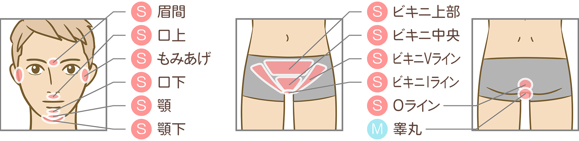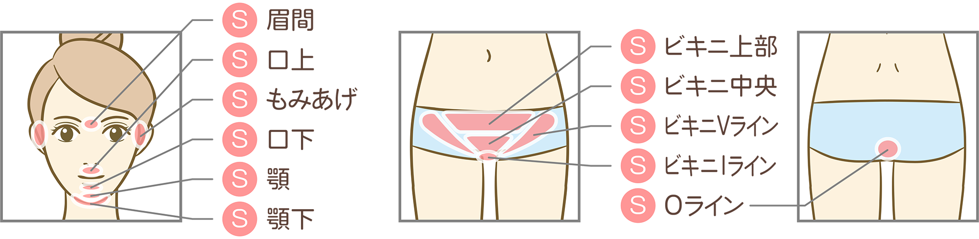 S | 額・眉間・頬・口下・口上・顎・顎下・もみあげ・フェイスライン・首(前面)・ワキ・ヘソ周り・乳輪周り・ヒザ・手の甲と指・足の甲と指・ビキニVライン(上部)・ビキニVライン(中央)・ビキニVライン(サイド)・ビキニIライン・Oライン | 3,000円 (1ヶ所) |