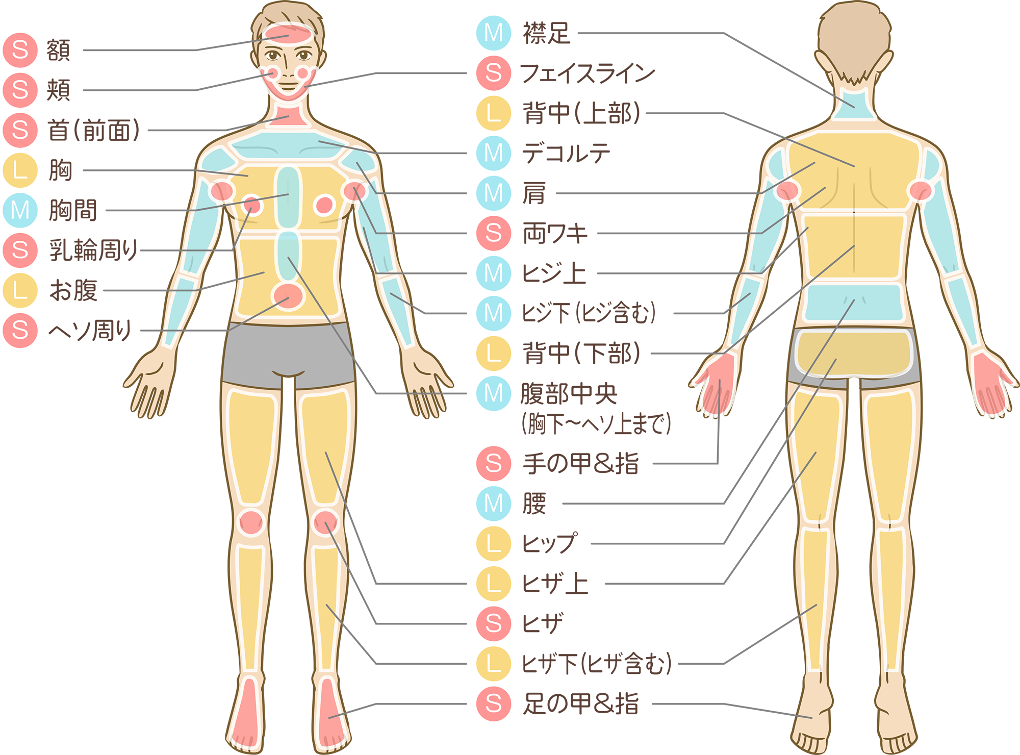 L | 胸・お腹・背中(上部)・背中(下部)・ヒップ・膝上・膝下(膝含む) | 8,000円 (1ヶ所) |
